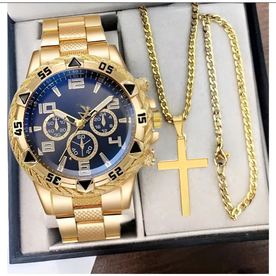 Kegllect Men Steel Band Quartz Watch Digital Scale Wristwatch Necklace Bracelet Set