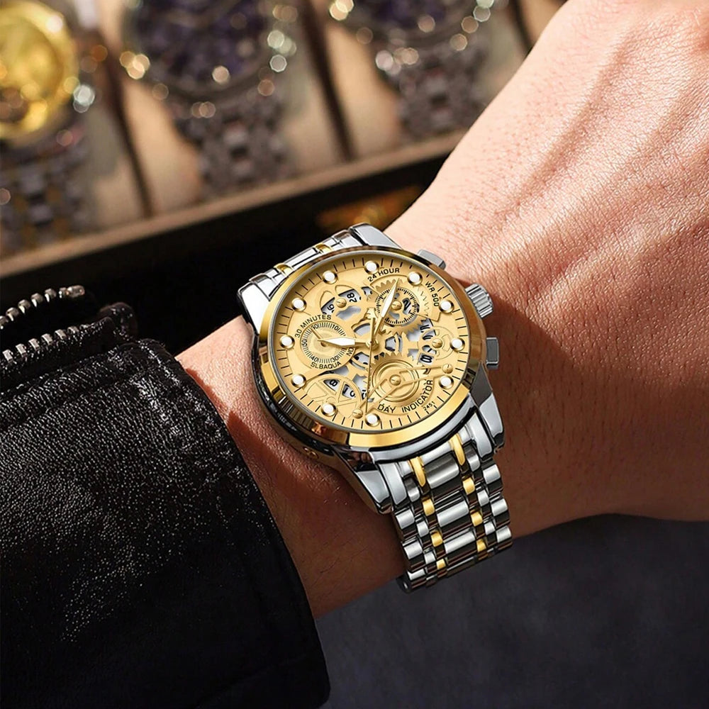 Men's Business Watch Skeleton Design Fashion Mechanical Style Stainless Steel Quartz Movement Calendar Waterproof Men WristWatch