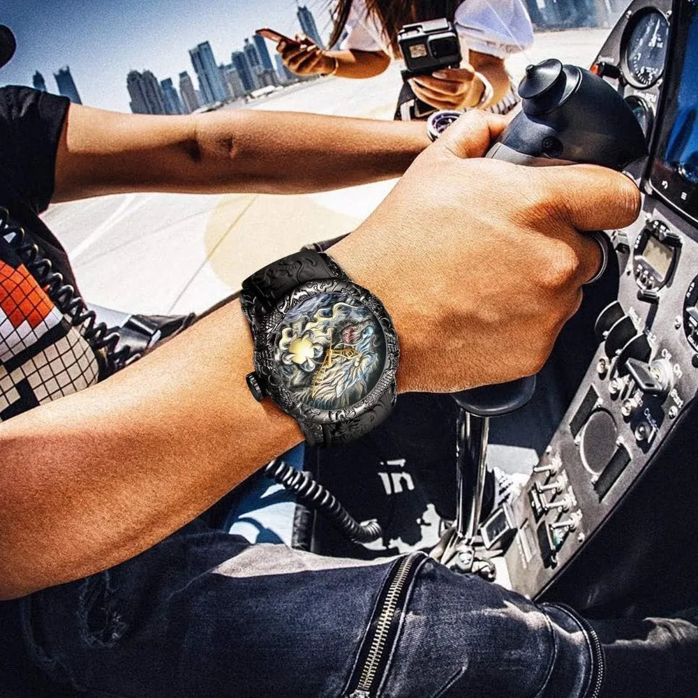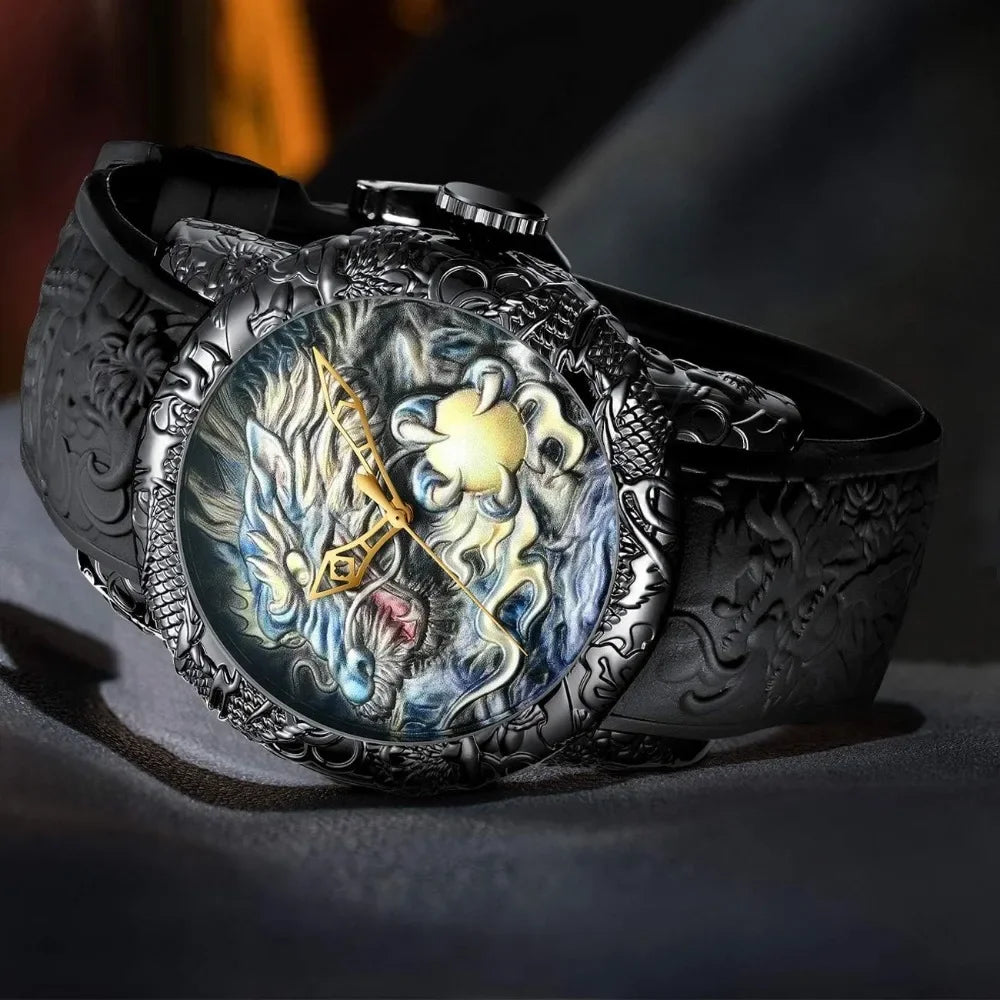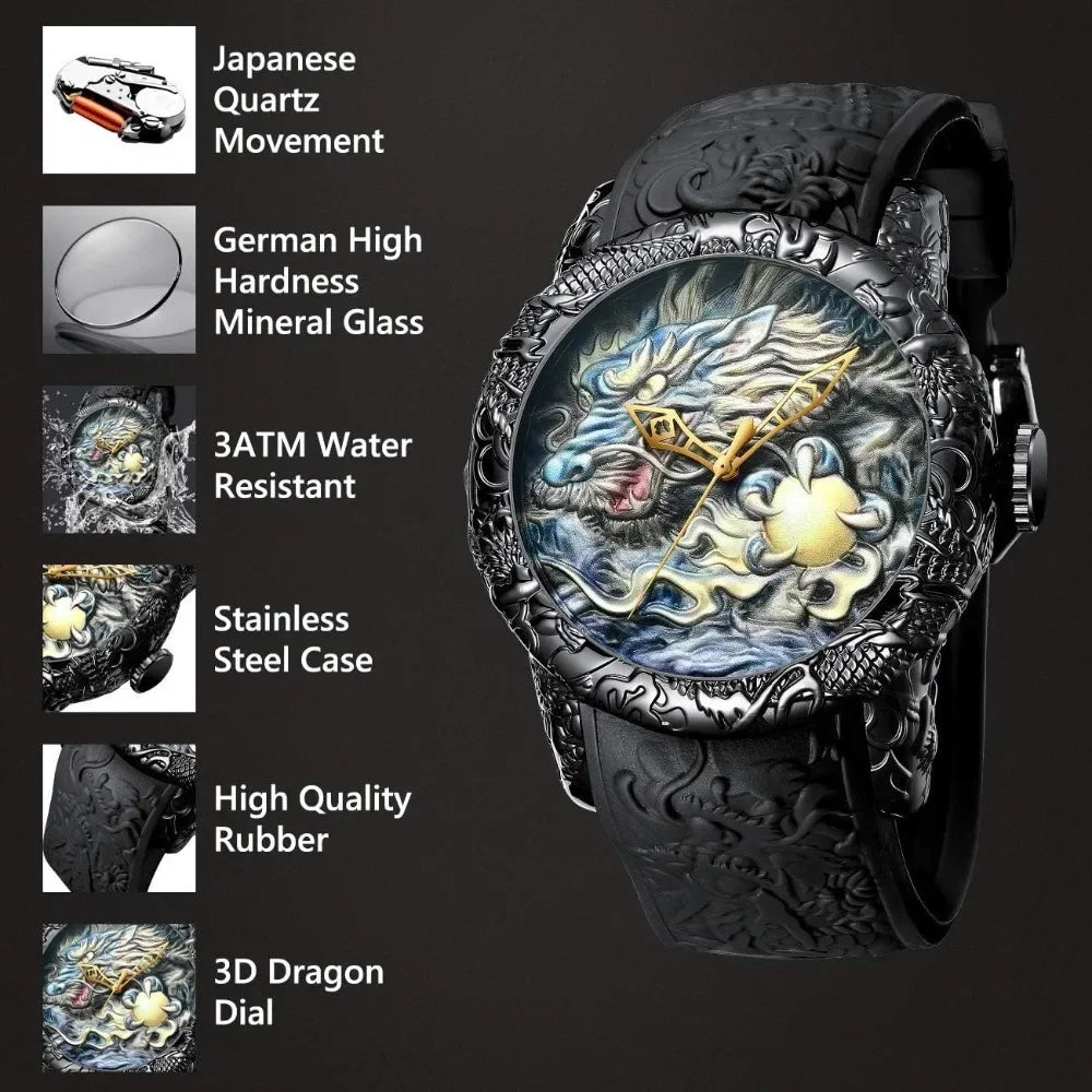 Mens Fashion Big Dial 3D Sculpture Dragon Watches Men Quartz Watches Luxury Exquisite Creative Wristwatch Male Clock Gifts