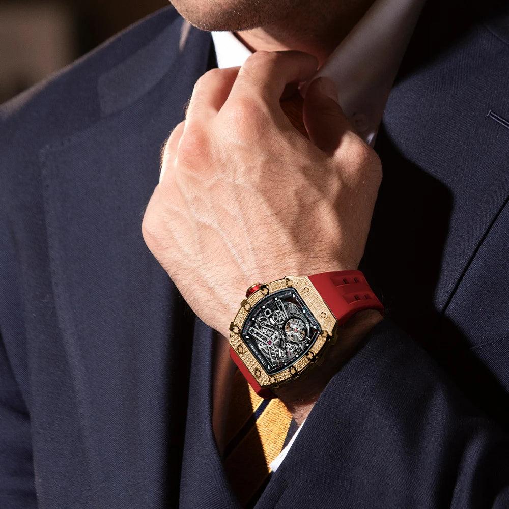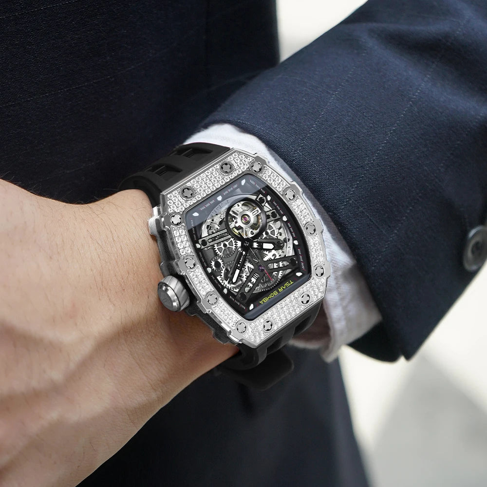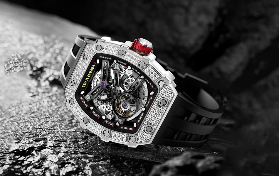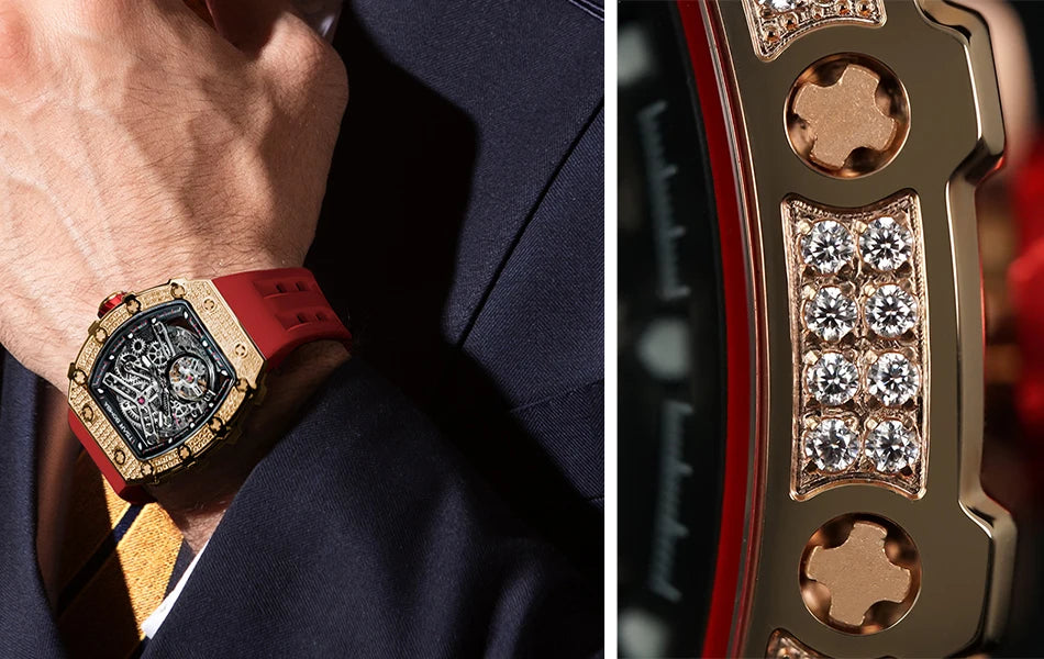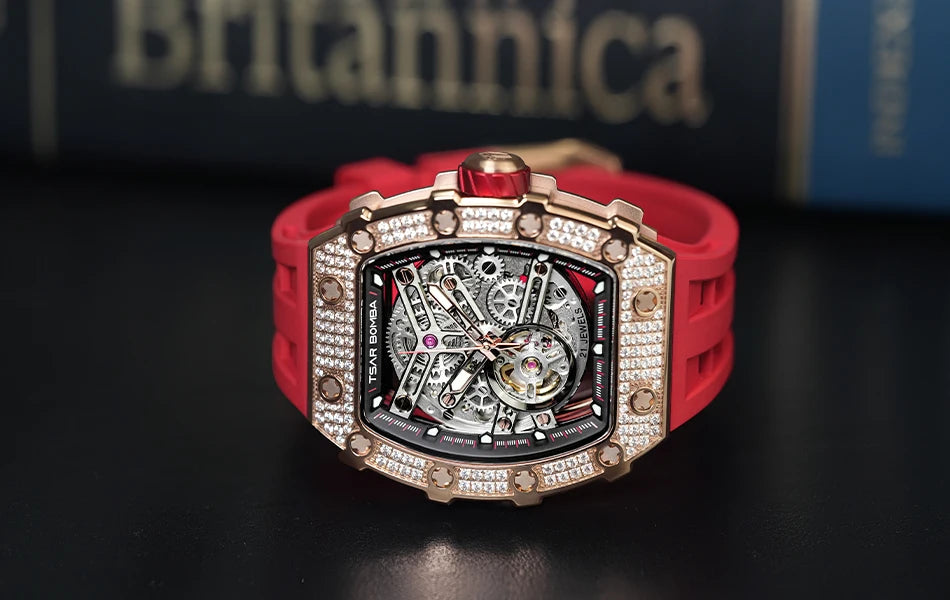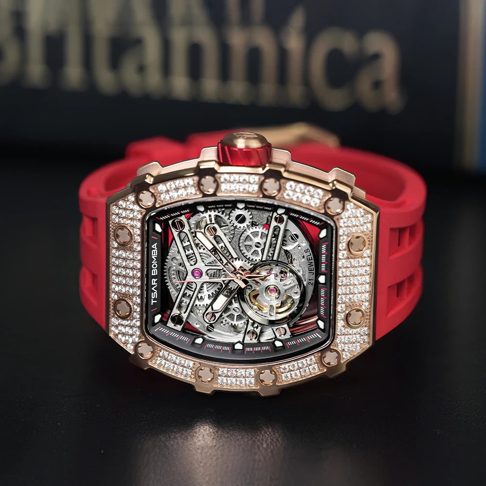 TSAR BOMBA Rose Gold Mens Automatic Watch Mechanical Wristwatch Sapphire Clock Fashion Skeleton Watch New Year Gift for Men